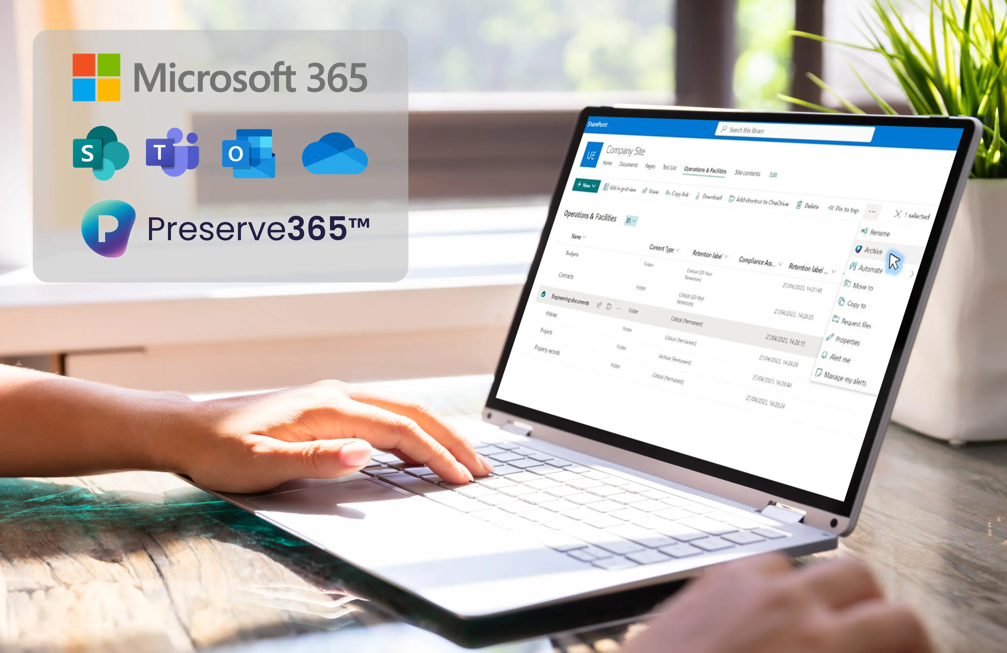 Now in Preview, Preserve365™ simplifies and automates compliance by making the archiving and retrieval of high-value SharePoint content a unified part of the Microsoft 365 experience.